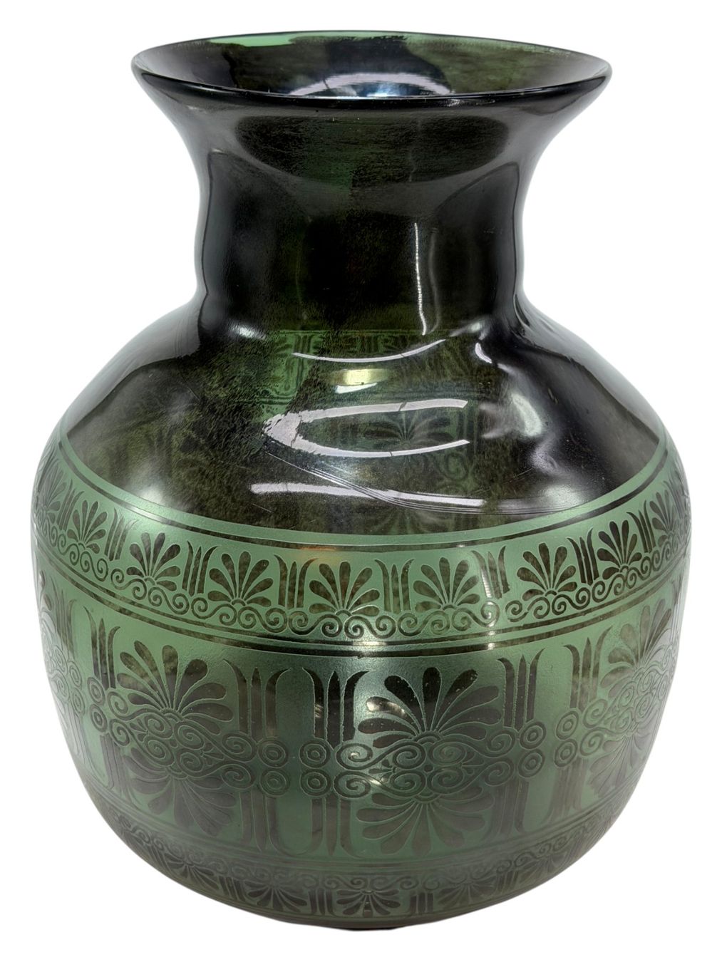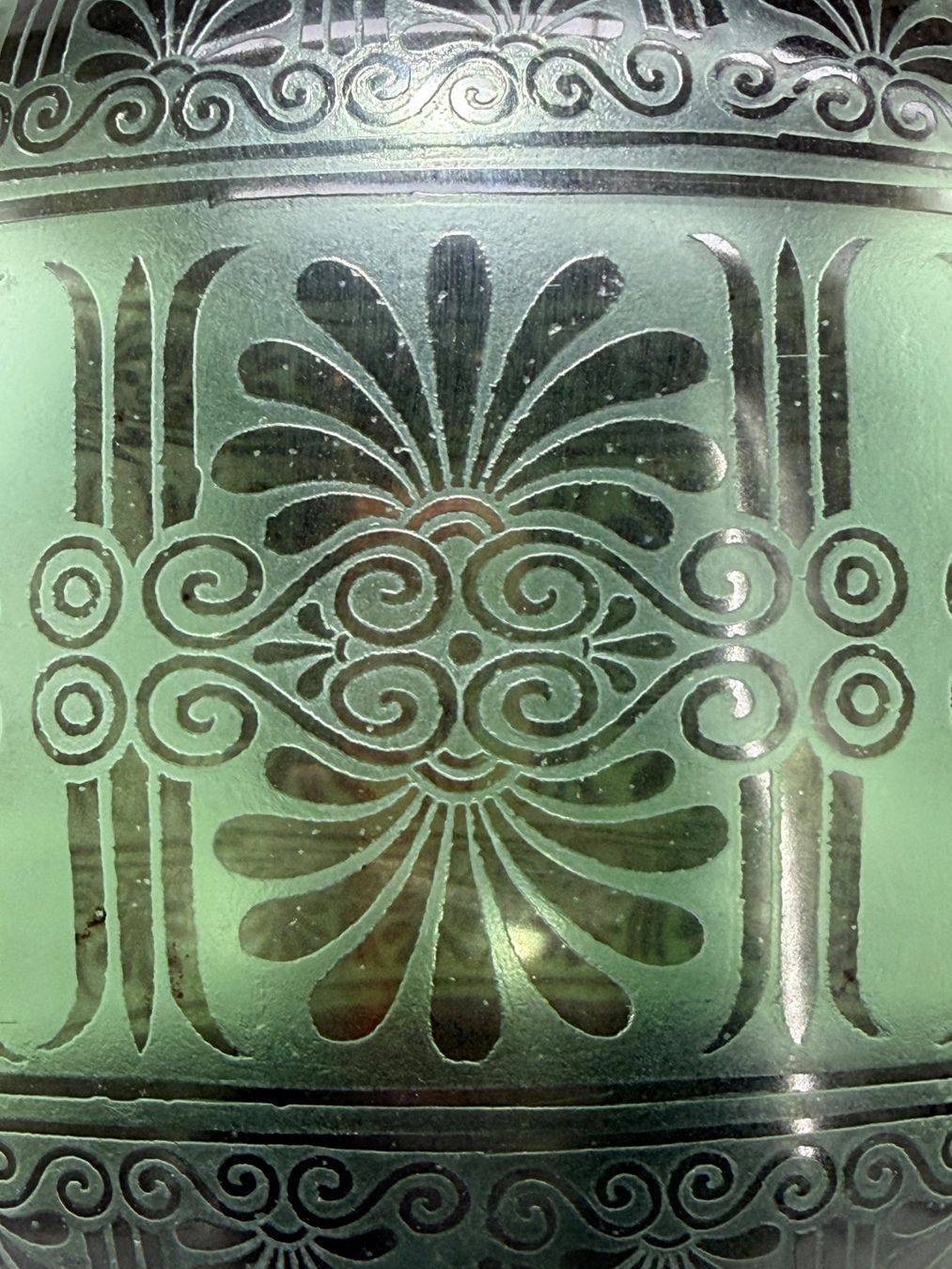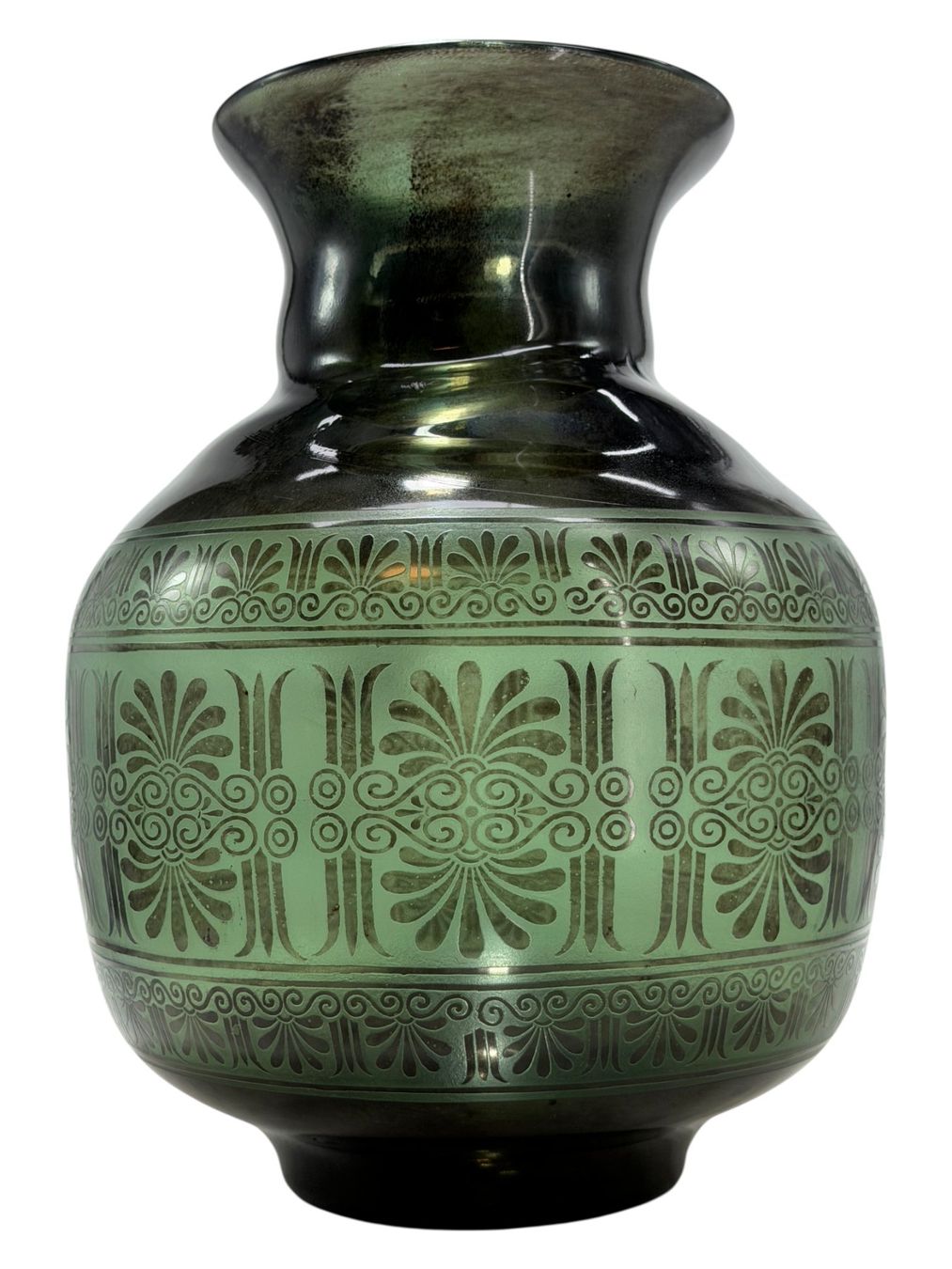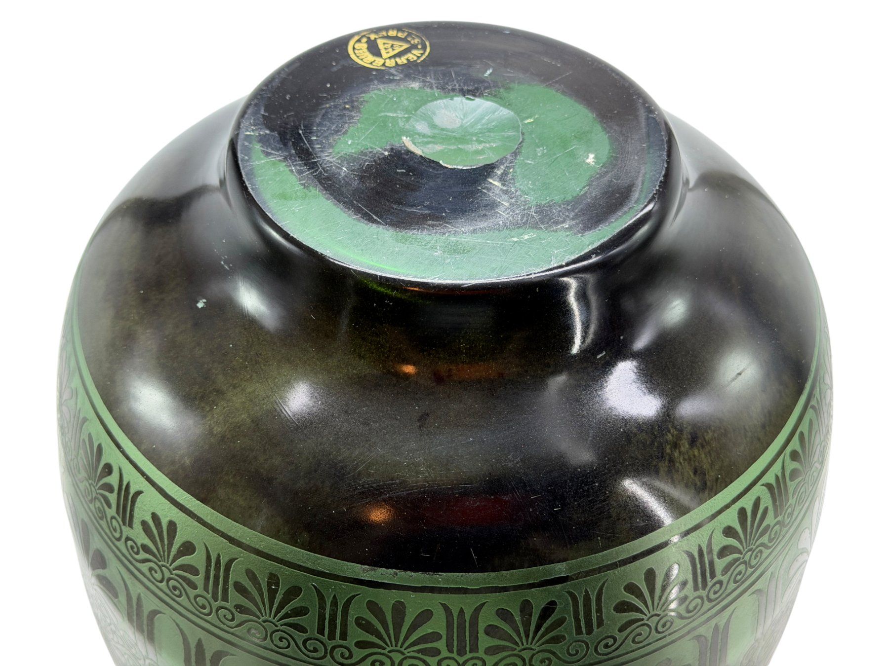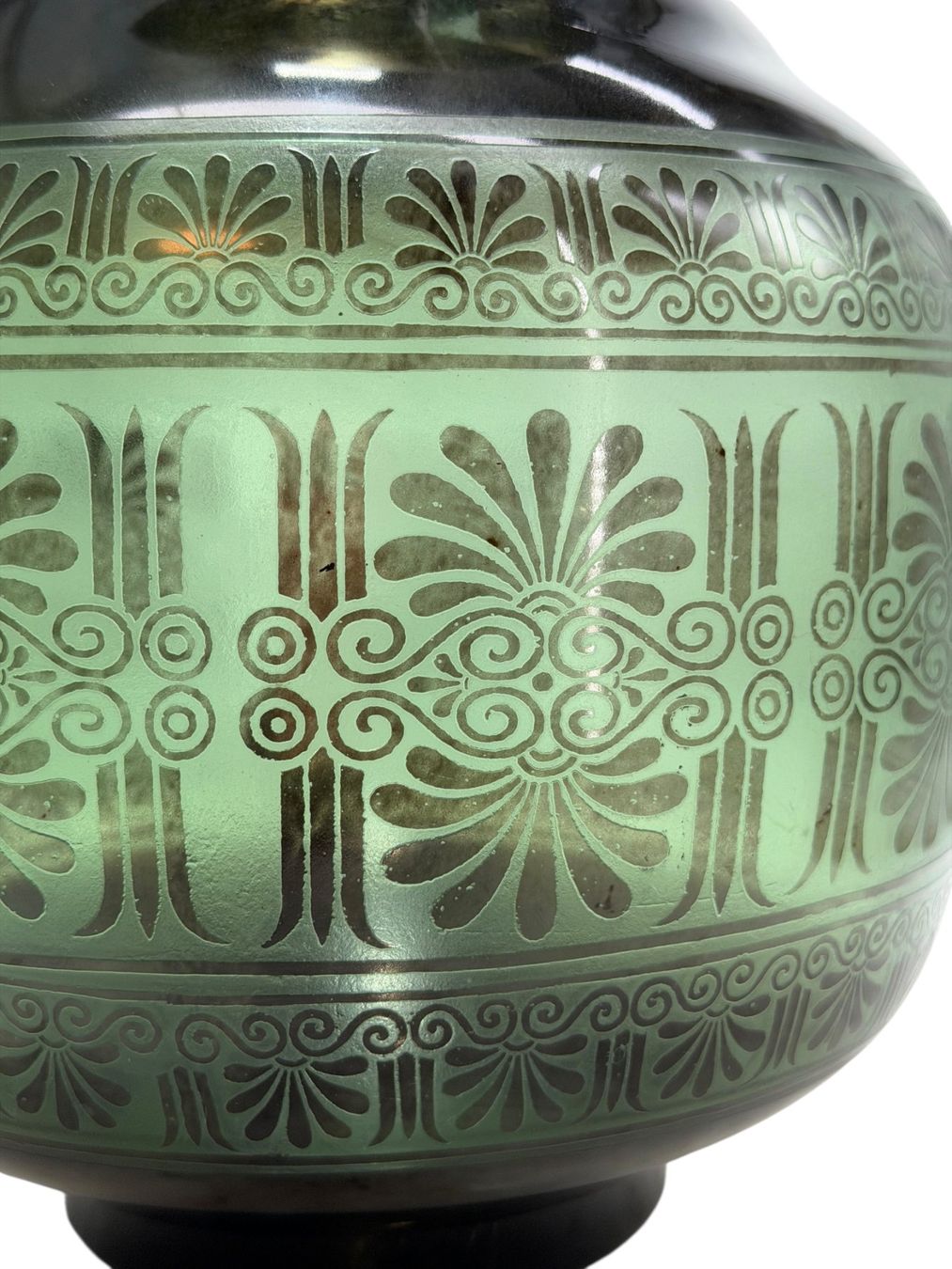 Décor à l’émail noir appliqué à l’aérographe, enrichi d’une frise gravée à l’acide.